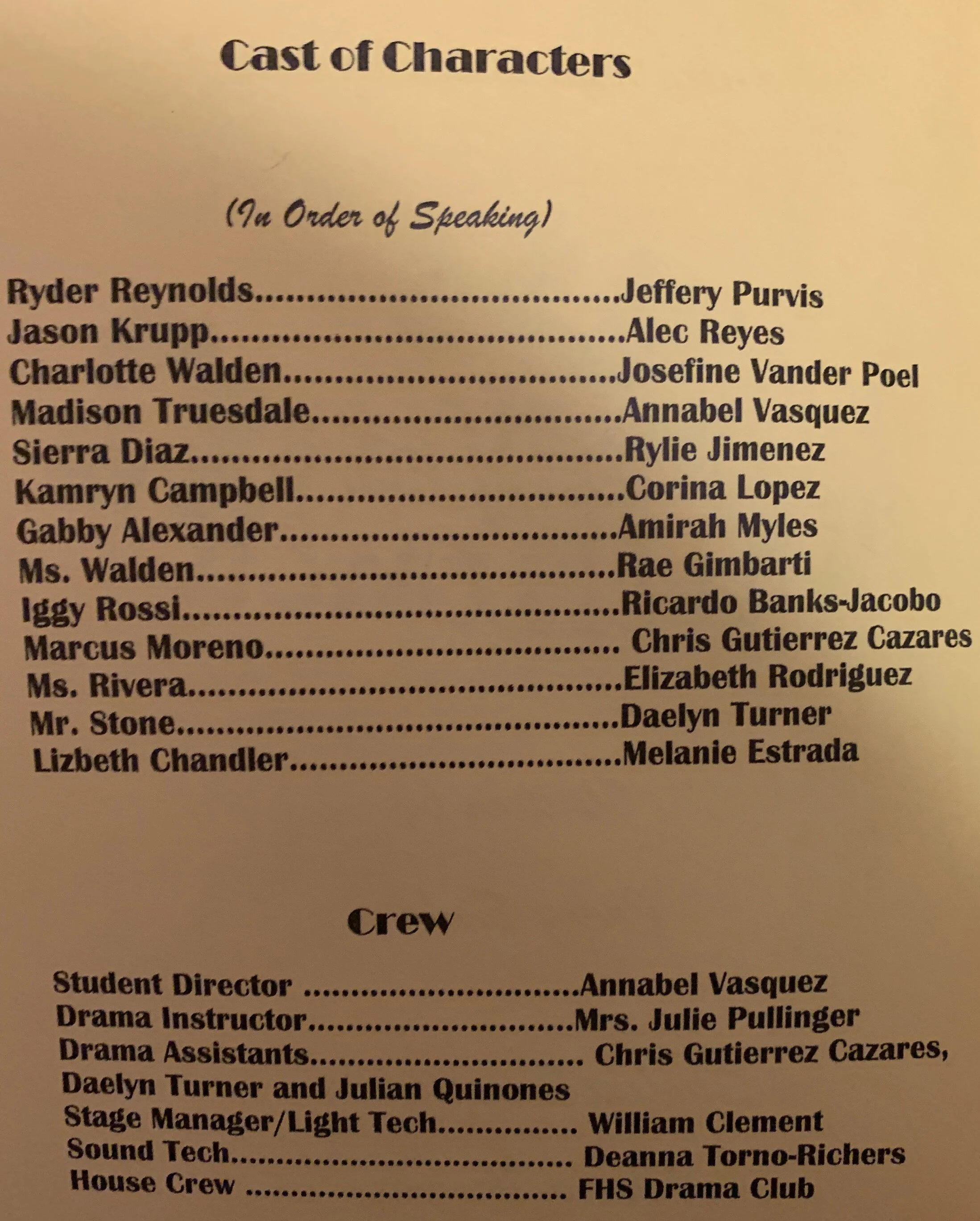The play was student directed by Annabel Vasquez (Senior) and with the lead role played by Fina Vander Poel, a junior at Fresno High. It was produced by special arrangement with Pioneer Drama Service, INC. Englewood, Colorado. Starting September 21, they rehearsed every Tuesday and Thursday for about two hours along with one Wednesday practice the week of the play. The actors said one of their biggest struggles was memorizing lines and the fact that they did have a couple people in the cast join late.