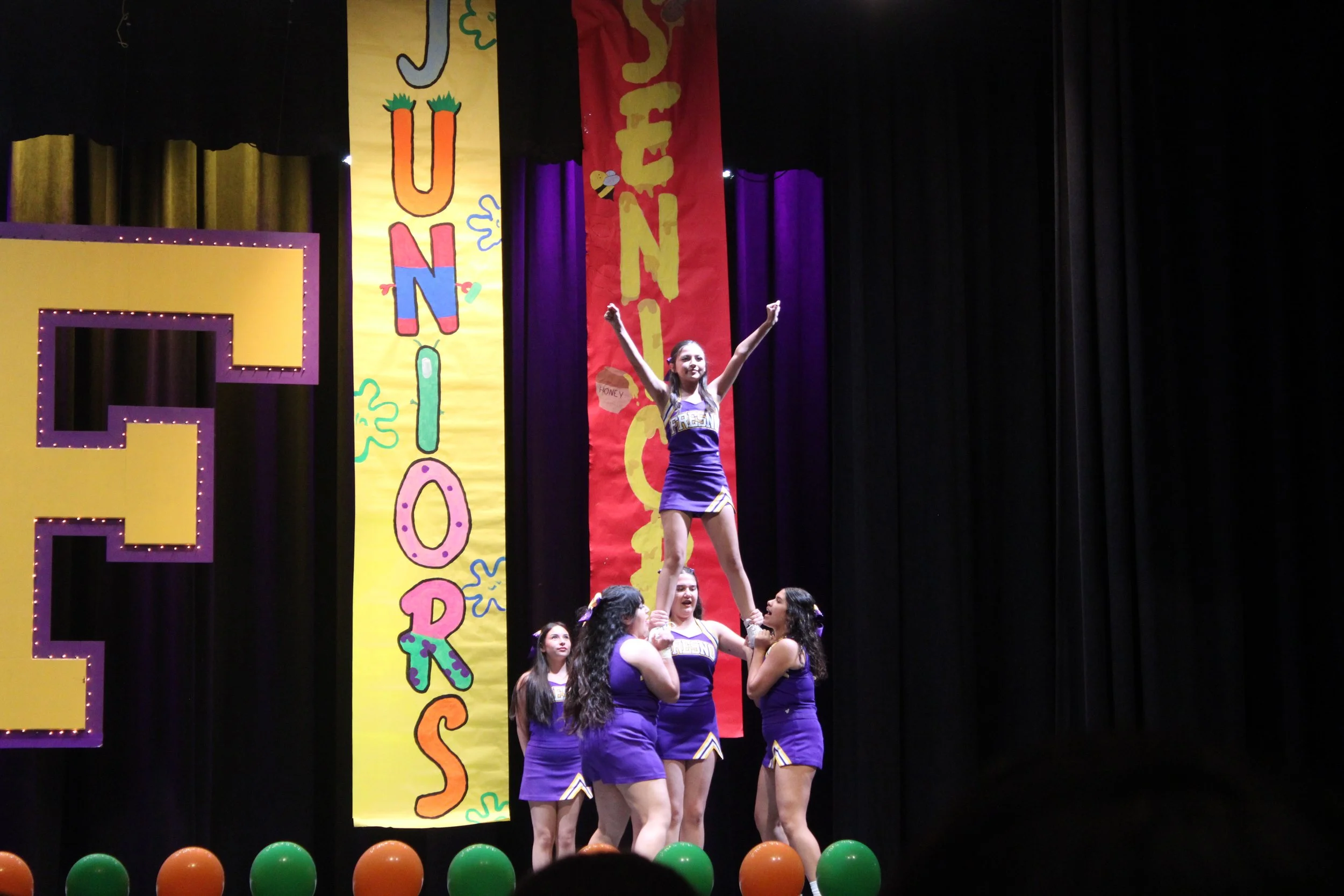 The Fall Sports Rally tends to have everyone sit down in the chairs of Royce Hall and introduce our current sports teams in seasons teams for example, Special Olympians, Cross Country, Girls Volleyball, Football, Girls Tennis, and Boys/Girls Water Polo. They also had games in between like musical chairs and a poster game. A large poster that was rolled up and tossed in each section of the seating you had to unroll it by throwing it back and getting a pink sticky note. The main purpose of these games was to keep the crowd entertained in between while they were giving us news and introducing our sports teams and the students in them. While introducing the teams JV and Varsity while both had their chance, they both put on quite a performance with flips and making pyramids.