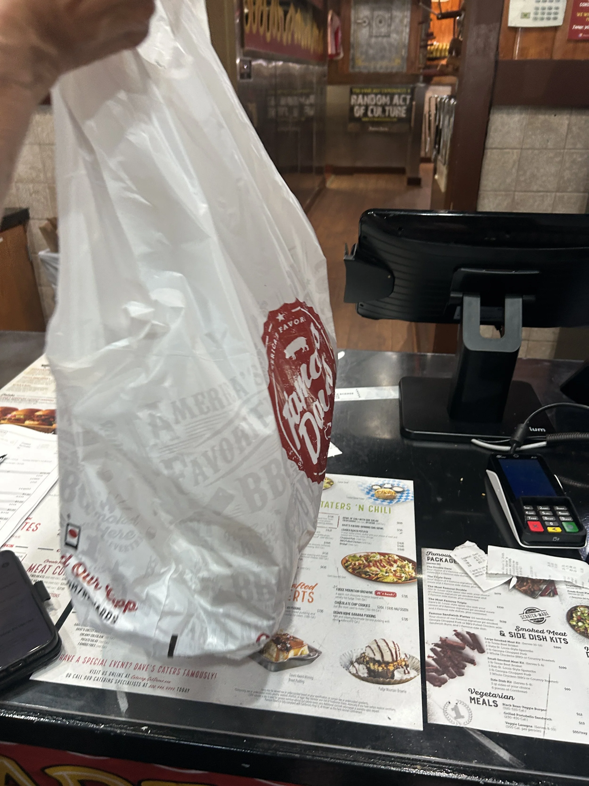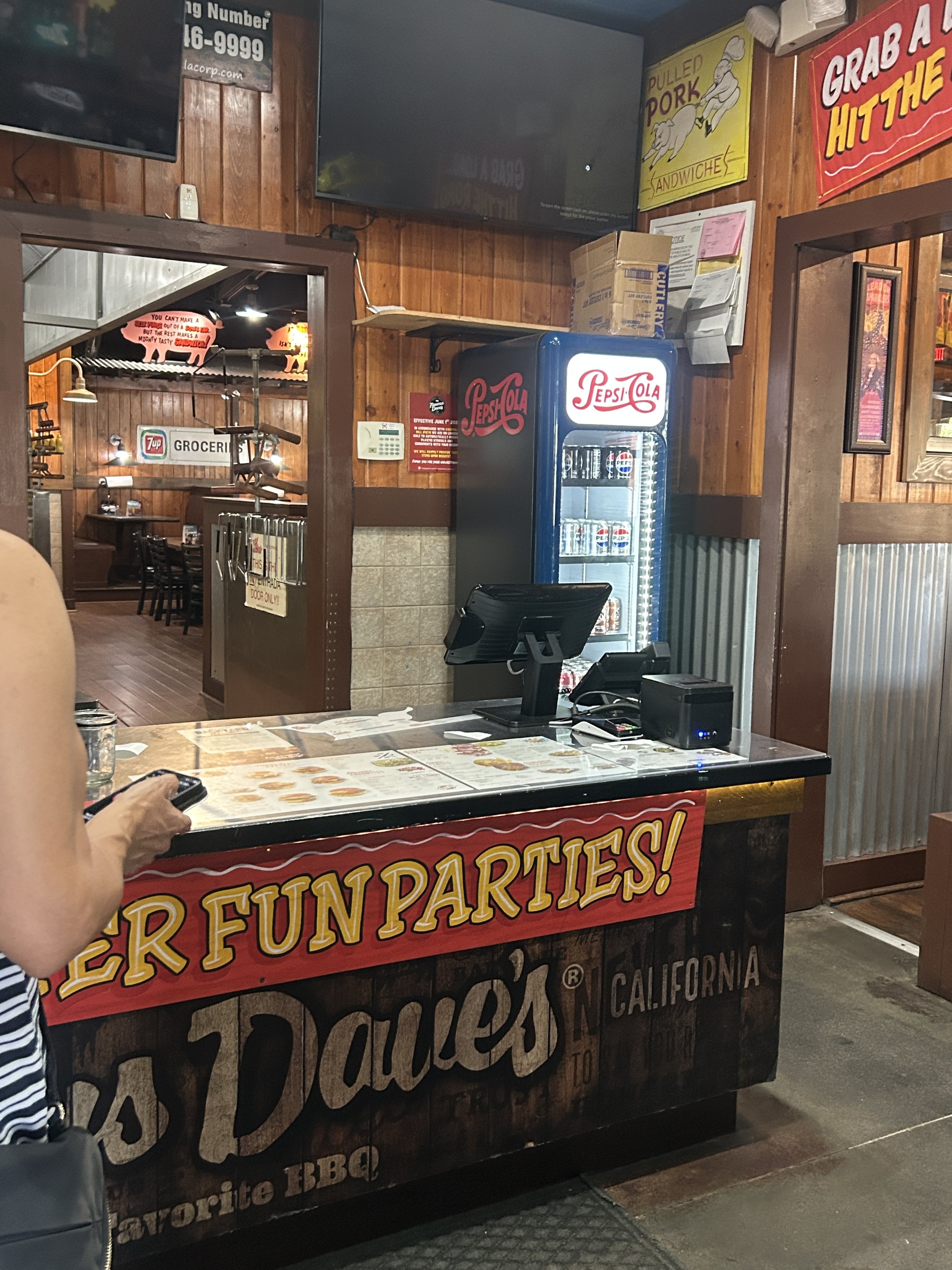 My family and I ordered take-out from Famous Dave’s Bar-B-Que to celebrate a family birthday. The outside of the restaurant is decorated with bricks and the famous pig. There is a decently sized parking lot with up-close handicap parking as well as parking reserved for to go orders. Walking in you are almost immediately greeted by the front staff who give a welcoming feeling. There are two doors to separate those who are dining in and those who are picking up or placing to-go orders. The subtle lights and quiet noise are perfect if you want to enjoy an evening dinner with your family, especially during the week. The inside interior is even more intriguing to look at than the outside of the building. The artwork of barbeque, Fresno State merch, the famous Dave pig, and trophies showing off their achievements.
