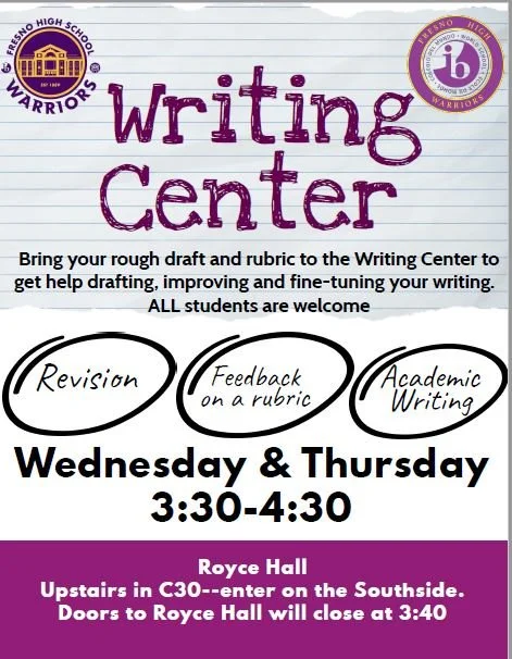 IB Coordinator Ms. Kyra Orgill is responsible for ensuring students have everything they need and more. New to Fresno High English teacher Mr. Rene Asencio, is there to guide students with the writing process. The facility is open on Wednesdays and Thursdays from 3:30 pm-4:30 pm.