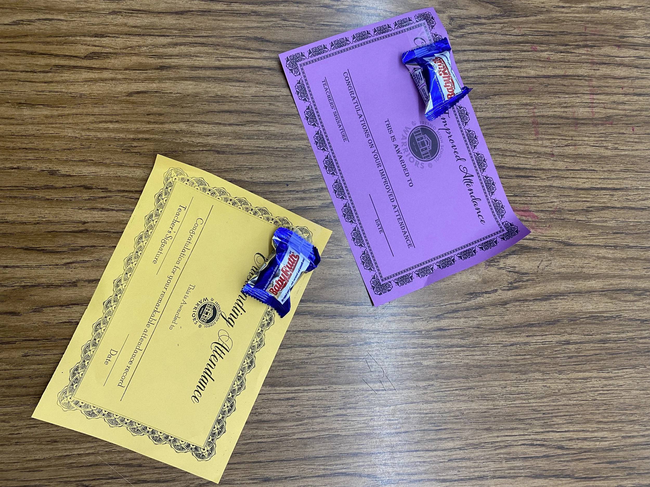 How this works is that a teacher nominates a student that has outstanding attendance since the beginning of the school year or a student that has been improving their attendance. The teacher will get an attendance certificate and will write the students' name that they have nominated and give it to the student the certificate to let them know they have been nominated. When the student has been nominated, they will be entered in a raffle and the office will announce the students whose names have been picked in the raffle, when that student hears their name, they will receive a prize for their good attendance.